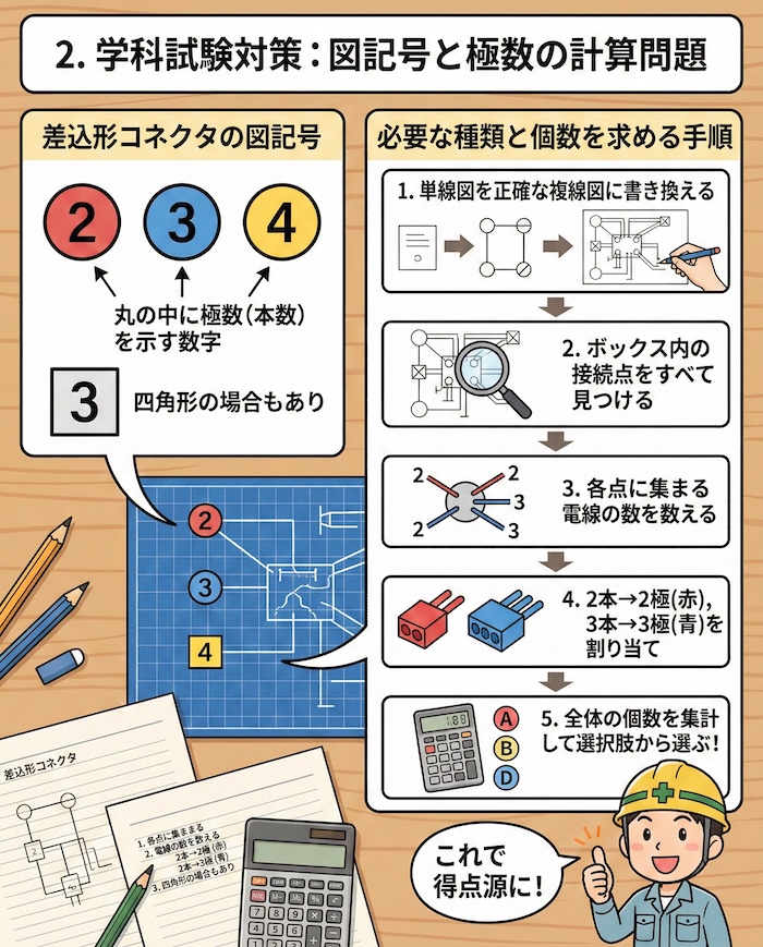 学科試験の配線図問題において、差込形コネクタは高い頻度で出題されます。確実に得点源にしましょう。