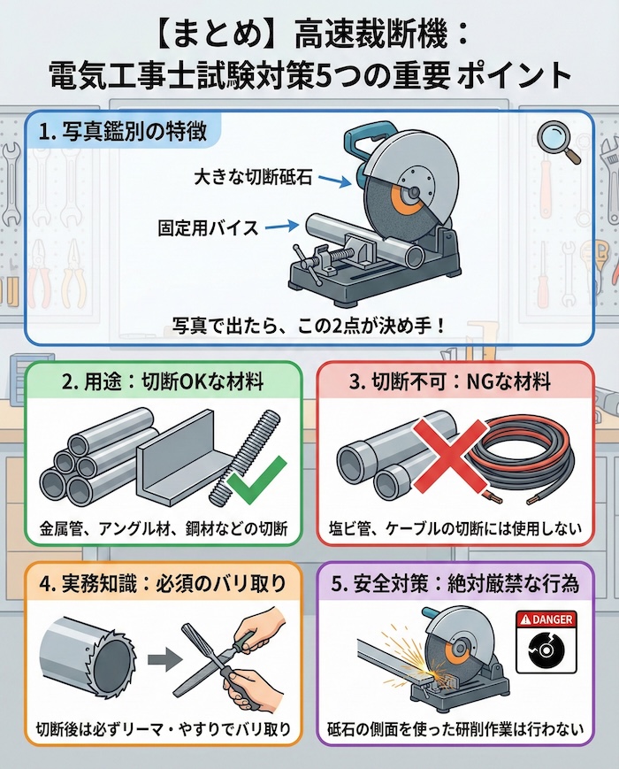過去の第一種電気工事士試験で「高速切断機は研削にも使用でき、といしの側面を使用する」という誤った選択肢が出題されたことがあります。