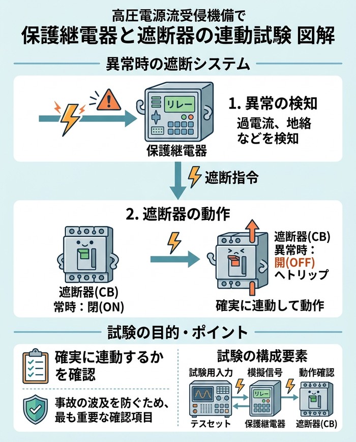 異常を検知しても遮断器が動作しなければ大事故につながるため、最も重要な確認項目の一つです。