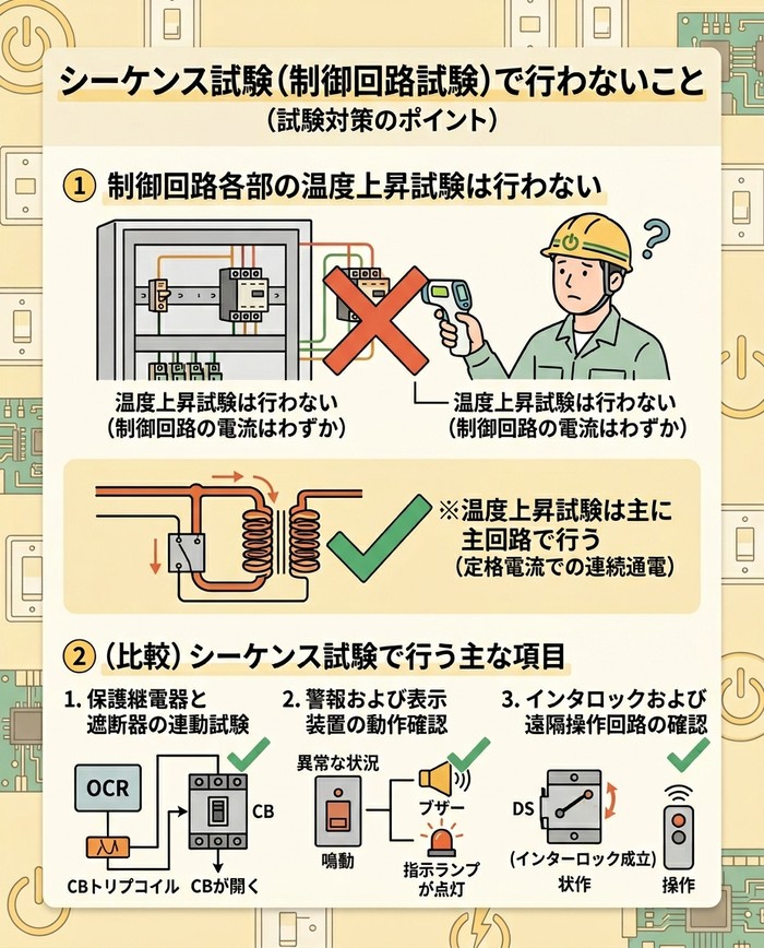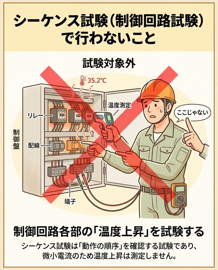 制御回路に流れる電流はごくわずかであり、シーケンス試験はあくまで「動作の順序や論理」が正しいかを確認するためのものです。そのため、機器や配線に定格電流を流し続けて温度が許容範囲内に収まるかを確認する「温度上昇試験」は、シーケンス試験(制御回路試験)の項目には含まれません。
