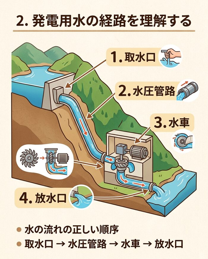 水力発電所で水がどのように流れていくか、その経路の順序を問われる問題も定番です。現場の図をイメージしながら覚えましょう。