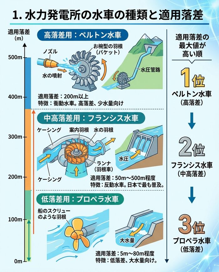 ・落差に応じた水車の種類(ペルトン・フランシス・プロペラ)の使い分け