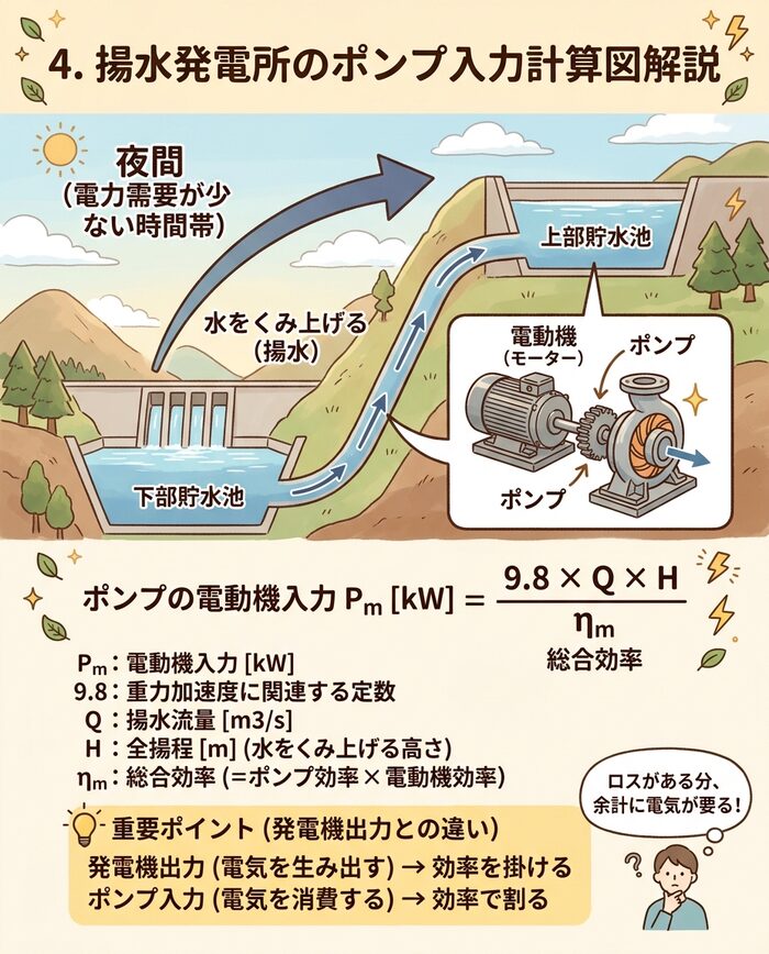 揚水発電所とは、電力需要の少ない夜間に余った電気を使って下のダムから上のダムへ水をくみ上げ(揚水)、昼間の電力需要が多い時間帯にその水を落として発電する施設です。ここでは「水をくみ上げるために必要な電力(揚水ポンプの電動機入力)」の計算が問われます。