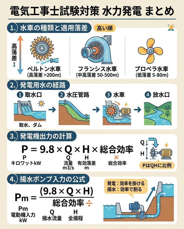 第一種電気工事士試験における水力発電のポイントは以下の4つに絞られます。