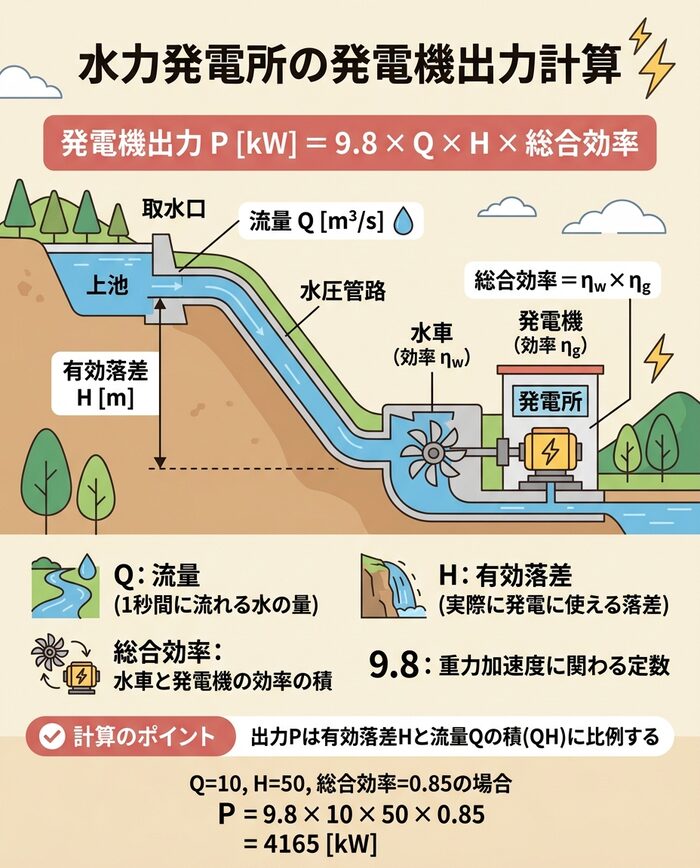 公式からわかるように、水車の出力Pは「有効落差H」と「流量Q」の積(掛け算)に比例します。試験では「水車の出力は何に比例するか」という文章問題も出題されるため、「出力PはQHに比例する」と覚えておきましょう。