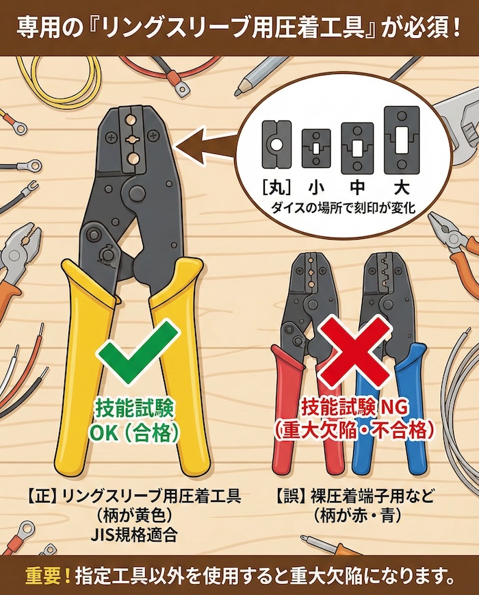 この工具は、持ち手(柄)の部分が「黄色」になっているのが最大の特徴です。柄が赤色や青色の工具は裸圧着端子用など別の用途の工具であり、これを使用すると技能試験では「不適切な工具の使用」として重大欠陥になります。