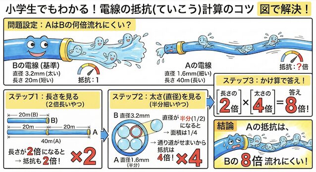 「直径が半分だから抵抗は2倍?」「長さが2倍だから…」と頭の中で数字がぐるぐるしていませんか?